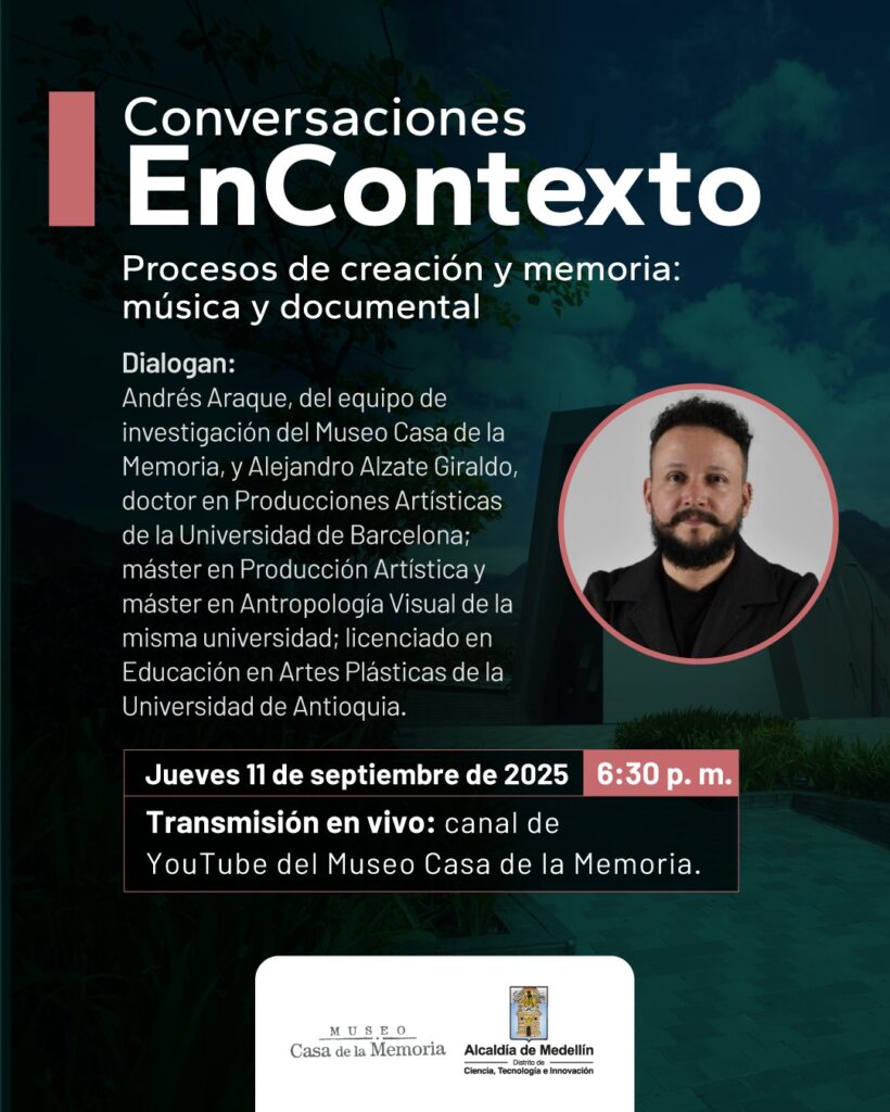 ConversacionesEnContextoProcesos de creación y memoria: música y documental Dialogan: Andrés Araque, del equipo de investigación del Museo Casa de la Memoria, y Alejandro Alzate Giraldo. Doctor en Producciones Artísticas de la Universidad de Barcelona; Máster en Producción Artística y Máster en Antropología Visual de la misma Universidad; Licenciado en Educación Artes Plásticas de la Universidad de Antioquia. Día: jueves 11 de septiembre de 2025. Hora: 6:30 p. m. |